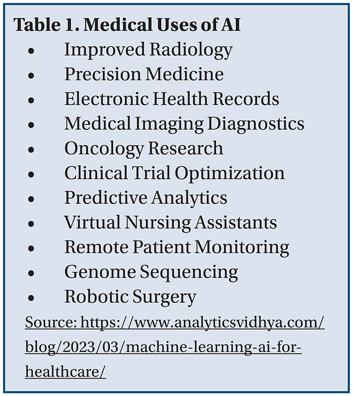 Current use of AI and machine learning is expanding throughout healthcare, as is research into its potential applications that many people predict will revolutionize the way healthcare is delivered. From drug discovery to personalized medicine to medical image analysis and predictive analytics, the power of AI to be trained in and excel at a range of clinical and administrative activities increasingly demonstrates its revolutionary capacities. (Table 1 lists a number of areas in which AI-based technology is being used or studied.