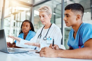 Doctor teaching medical students on laptop in an office at the hospital while writing notes. Experienced professor with stethoscope training healthcare workers. Surgeons analyzing results on computer