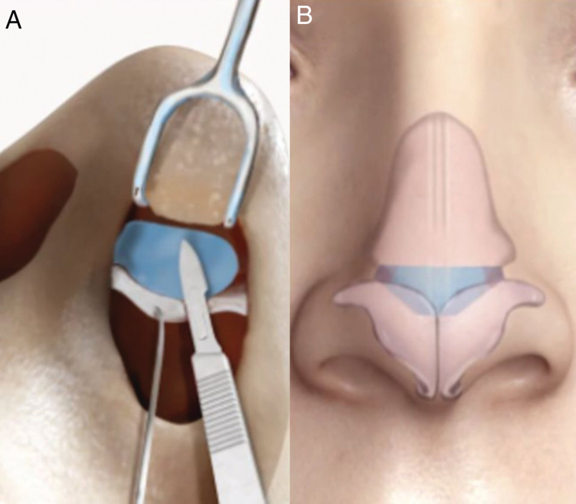 In this study, we report on the BFG secondary contouring procedure for patients with external nasal complaints following BFG placement and patient-reported outcomes following the procedure. Heretofore, no prior studies discuss this technique and its outcomes. We define BFG secondary contouring as surgical contouring of the BFG at a second procedure following the primary placement surgery (Fig. 1). The aims of our study included describing the surgical technique, presenting demographic factors that may be related or may predispose patients to desiring BFG contouring, and comparing patient-reported outcomes following primary and contouring surgeries. We hypothesized that BFG secondary contouring improves aesthetics while maintaining durable nasal breathing outcomes.