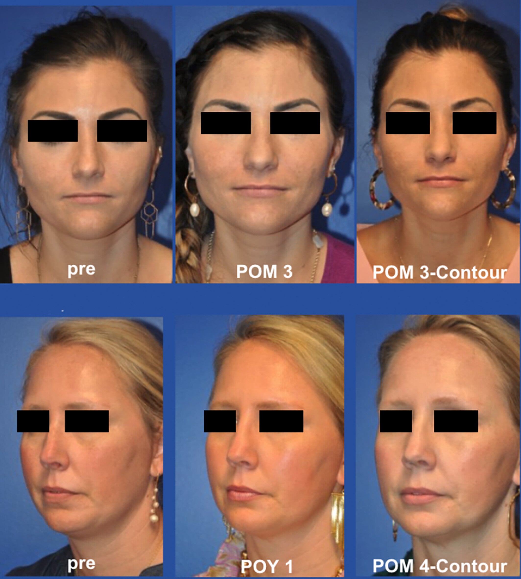 All patients were operated on by the senior author or under the direct supervision of the senior author. BFG placement is typically performed under general anesthesia along with concomitant nasal procedures, most commonly including revision septoplasty and turbinoplasty. BFG is harvested from conchal cartilage due to favorable elasticity and perichondrium to hold the sutures long term. The graft is placed through an endonasal approach. BFG secondary contouring is offered as an in-clinic procedure or under general anesthesia, but general anesthesia is preferred. The contouring is approached through unilateral or bilateral intercartilaginous incisions; care is taken to place the retractor in the sub-SMAS [superficial musculoaponeurotic system] plane while leaving the BFG “down” to avoid interrupting the adherence between the concave surface of the BFG and the upper lateral cartilages. A fresh 15-blade is then used to contour irregular or bulging aspects of the BFG. Limited local anesthesia is used directly over the site of external contour irregularities. Nasal packing or splints were not used during any surgeries. The current technique involves placement of through-and-through sutures over a small Telfa to close the dead space after contouring.